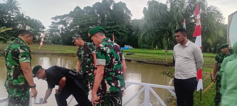 Pangdam XVIII/Kasuari, Mayjen TNI Christian Kurnianto Tehuteru saat penyemaian bibit ikan atau penaburan bibit ikan di kolam kompleks Markas Batalyon Infanteri 762/Vira Yudha Sakti. (Foto: WAHANANEWS.CO / Hotbert Purba)