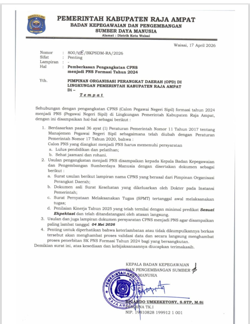 Surat bernomor 800/106/BKPSDM-RA/2026 yang ditandatangani oleh Kepala BKPSDM Raja Ampat, Ricardo Umketony, S.TP, M.Si, pada tanggal 17 April 2026 ini ditujukan kepada seluruh Pimpinan Organisasi Perangkat Daerah (OPD) di lingkungan Pemkab Raja Ampat.